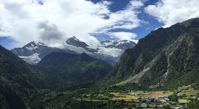 隊(duì)伍在休息站充分休整后,再次出發(fā),前往今天的目標(biāo)地:雨崩村。接下來(lái)的路都是下坡,我們更清晰地見(jiàn)到了期待已久的雪山。遠(yuǎn)遠(yuǎn)的可以望見(jiàn)山上的冰川,圣潔的雪峰隱匿在云間。騰舞的云氣、銀白的雪色、蒼翠的山林和挺拔的山峰融為一體,漏斗型的冰川倒掛在半山腰。觀賞著美景,不知不覺(jué)間便到達(dá)上雨崩村。見(jiàn)時(shí)間充足,在落腳的旅店休息片刻后,大部分隊(duì)員輕裝上陣決定去神瀑看看。