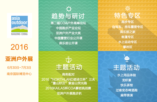 今年,亞洲戶外展匯集650多家戶外用品參展商和品牌,展會規(guī)模4.8萬平方米,是一場屬于戶外品牌、屬于媒體朋友、屬于親愛的專業(yè)觀眾們的戶外盛筵。2016年,亞洲戶外展將有機結(jié)合靜態(tài)展示、場景體驗、趨勢研討三種展覽形態(tài),實現(xiàn)傳統(tǒng)優(yōu)勢與新興板塊完美嫁接,并匠心策劃一系列聚合品牌、經(jīng)銷商、媒體、俱樂部、賽事組織等優(yōu)勢資源的現(xiàn)場活動。