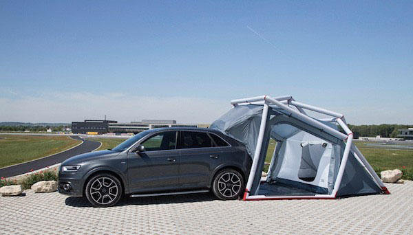 來自德國的戶外用品設(shè)計公司 Heimplanet 為奧迪 Q3 Quattro 開發(fā)了一款充氣野營帳篷,不用時收納到車頂行李架上,使用時攤開,只需 7 分鐘即可完成充氣、組裝。這款帳篷用充氣柱子支撐,每根柱子各自獨立,充氣之后可以和汽車后備箱相連,給司機和乘客提供一個更寬敞的休息場所。